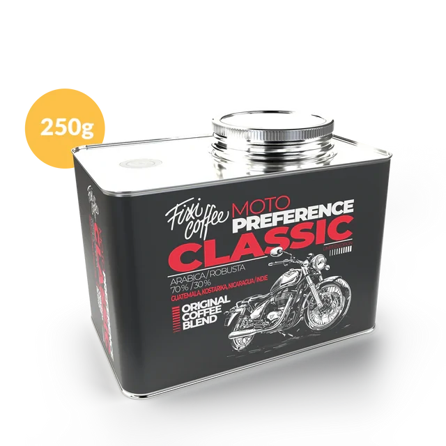 Káva je balena v originálním dárkovém kanistru, který chrání čerstvost a zároveň poslouží jako stylový dárek pro každého kávového moto nadšence.